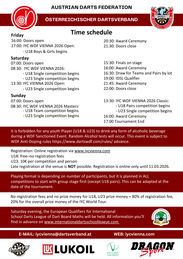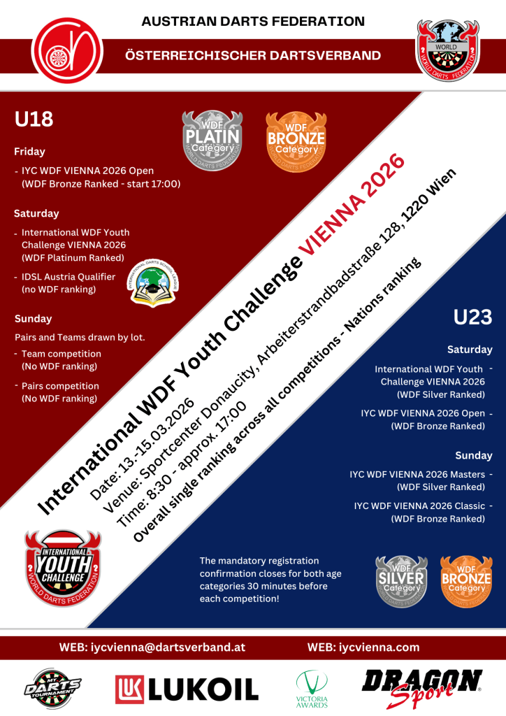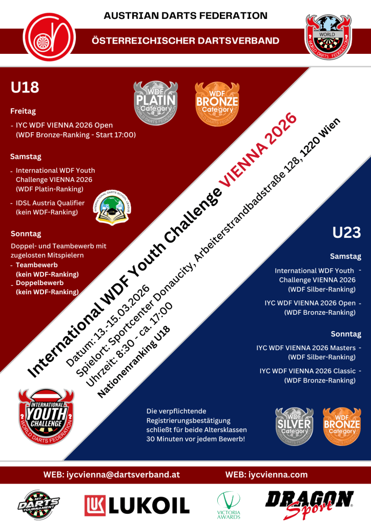 The next International WDF Youth Challenge Vienna will take place at the weekend 13.-15.03.2026 at the Sportcenter Donaucity, Arbeiterstrandbadstraße 128, 1220 Vienna. The IYC VIENNA is a 3-day-event with 5 competitions: The PLATIN-graded boys and girls singles competitions on saturday and the pairs and teams competitions on sunday. Additionally to this traditional tournaments, a new WDF-ranked singles tournament with at least BRONZE-grading will be held at friday evening!