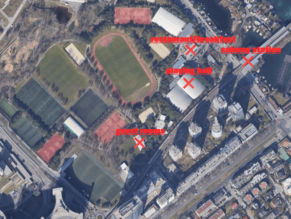 For accommodation, it is possible to book rooms at the venue (Single room 80€ p.n./Double room 100€ p.n.) via the Austrian Darts Federation after the first-come-first-serve principle. If you want to have breakfast included, the prizes are 105€ for a single room and 145€ for a double room. If you have to cancel your room, please be aware that full refund is only possible until the 20th of february. A 50%-refund is possible until the 06th of march, afterwards we cannot provide any refund. In the case of interest of booking a room, please contact iycvienna@dartsverband.at for further details. To have a better picture of the area, you can also check out the site plan below.
